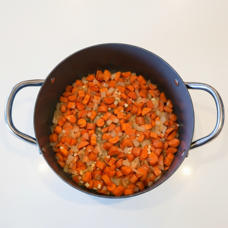 Step 2: Cook the onion, carrots, and garlic with small splashes of water until tender and lightly golden.