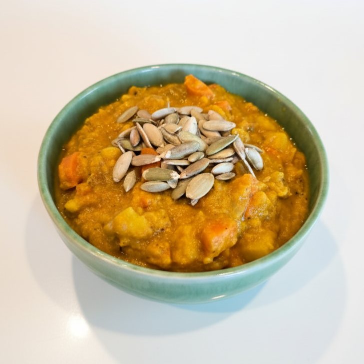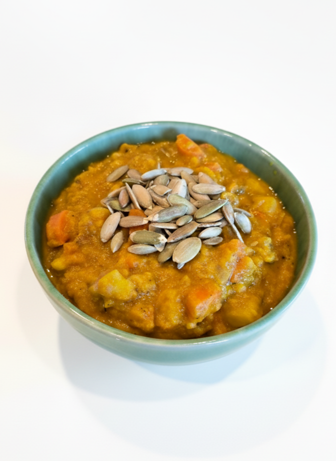 Golden and comforting: The warm curry spices, pumpkin, and creamy lentils make every bite feel like a hug from the inside out.